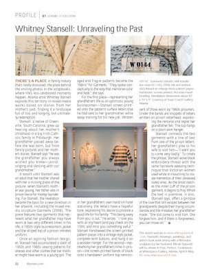 FiberARTS, the magazine on contemporary textile art and craft, recently profiled artist Whitney Stansell in the April/May 2010 issue. Discover how she interweaves fragments of family history, memory, fabric patterns, and vintage clothes to create mixed-media sculpture about love, loss and forgiveness.