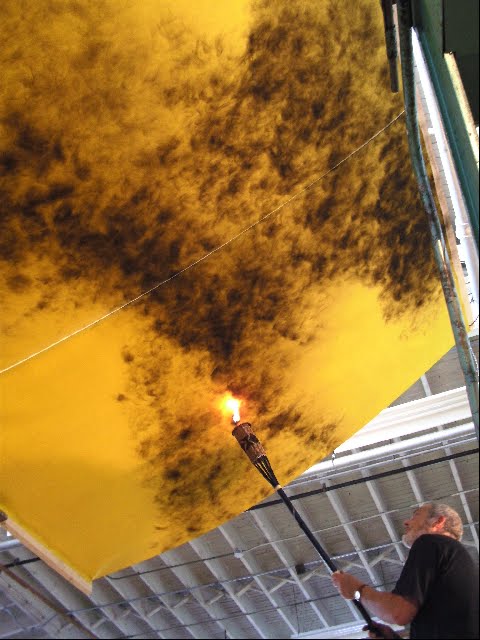For Seepages, Kate Stewart has also collaborated with artist Ward Davenny to create a large-scale painting utilizing paint and soot. (Image Left: Davenny in action “smoking” the canvas.)