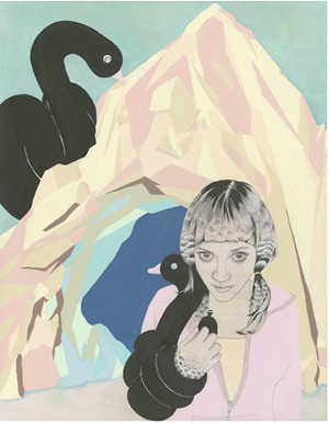 Softcore War is the coming of age where a sweet 16 turns salty or deadly in a sugarcoated world that remains isolated and disconnected from the true realities of war. Both metaphorically and symbolically, Manker also employs animal imagery of swans and lambs in the dual role of victim and accomplice. She has created this series on braced wood panels ranging from 12″x12″ to 30″x40″ using graphite, colored lead, acrylic ink, acryla-gouache and acrylic paint.