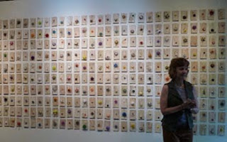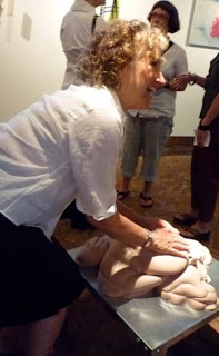 Created from a clay mold, David Grant’s latex sculptures are rooted in the homosexual subculture of “gainers.” (please see entry dated August 11, 2010) Yet, Grant’s touch of silliness, irreverence, bravado and eye for color invite the viewer to touch. As Leslie exclaimed: “Squooshy! DO TOUCH!”
