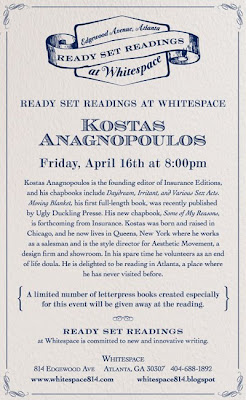 Please join us this Friday, April 16th @ 8pm for the next “Ready Set Readings” with poet Kostas Anagnopoulos.