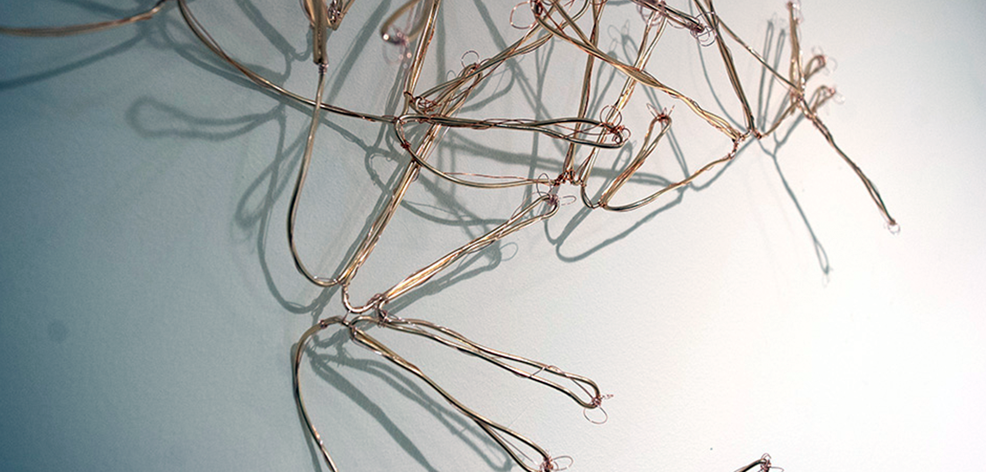 The Network is an installation consisting of woven wire, laser cut numbers, and a spiral of blue circles with a time-lapse video of clouds playing over the blue vortex. Each component works together to describe the digital nature of our connections and communications. The wire is woven similar to root structures of Bermuda grass, which seems to have no beginning or end. This concept was explored by philosophers who said our society doesn’t share and learn by a tree of knowledge, but by rhizome structures found in plant roots. The 1/0 plexiglass numbers describe the invisible digital data-driven world amidst a swirl of blue circles in a vortex pattern found in cosmic energy systems. The time-lapse video of clouds moving across the composition is a metaphor about the digital cloud where our personal data is held. I am interested in how ideas pass from one person to another in today’s social media world. I am curious how computers, social media and software capabilities have changed our communications and memories which is why I made this installation.